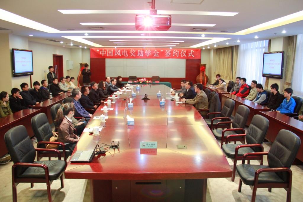 On the afternoon of 18th, March, the signing ceremony of “China’s Wind Power Scholarship and Grants” was held in our university. Executive Director and Executive Vice President Yu Weizhou, CTO Lu Yichuan, Chief HR Wang Haiwei of China Wind Power Group Co.,Ltd and Deputy Party Secretary Hao Yingjie of our university all attended the ceremony. China’s Wind Power Scholarship and Grants was set up by China Wind Power Group Co.,Ltd mainly aimed at subsidizing and awarding excellent undergraduates, postgraduates and excellent teachers in teaching and scientific research in School of Renewable Energy Resources. The agreement lasts for five years during which China Wind Power Group Co.,Ltd will fund 200,000 yuan per year for the Scholarship and Grants. Deputy Party Secretary Hao Yingjie expressed gratitude for the lasting financial aid of China Wind Power Group Co.,Ltd to the students of our school. He also pointed out that the establishment of scholarship and grants reflects the sense of social responsibility that a successful enterprise undertakes and that the selfless donationsy relieves life pressures of many students in NCEPU and provides a driving force for their dedication to study and development as well. He expressed wishes for further communication and cooperation in areas such as talent cultivation, academic exchange and scientific researchc. Executive Vice President of China Wind Power Group Co.,Ltd Yu Weizhou, who is also a specially hired professor of our school introduced the developing history and current situations of the company. He expected China Wind Power Group Co.,Ltd and NCEPU would have wide and long-term cooperation to jointly promote the prosperity of China’s new energy industry. He also expressed that NCEPU would qualify itself as soon as possible to reach the domestic and world first-class level in field of renewable energy research and talent cultivation. In the signing ceremony, the student representative Gao Xiaoli from School of Renewable Energy Resources gave a speech. She expressed gratitude for the generosity of China Wind Power Group Co.,Ltd and said that all the students in NCEPU would make persistent efforts and self-improvement to reward the company’s support and loves. The scholarship agreement was signed by Hao Yingjie and Yu Weizhou. At the same time, Hao Yingjie awarded Lu Yichuan, CTO of China Wind Power Group Co.,Ltd with a letter of appointment as a specially-hired professor of NCEPU. Heads from Student Affairs Department, Graduate Affairs Department, School of Renewable Energy Resources, University-enterprise Cooperation Office, Education Foundation and other relevant departments also attended the ceremony.